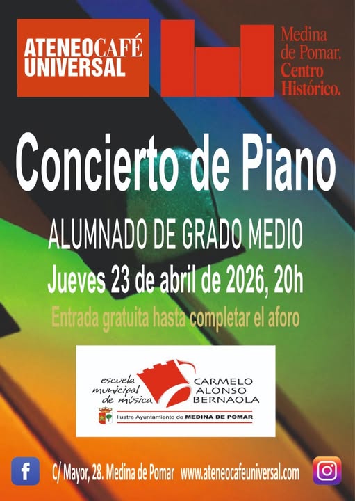 Concierto de Piano. Alumnado de Grado Medio. Jueves, 23 de abril de 2026 a las 20:00 h. Entrada gratuita hasta completar el aforo.